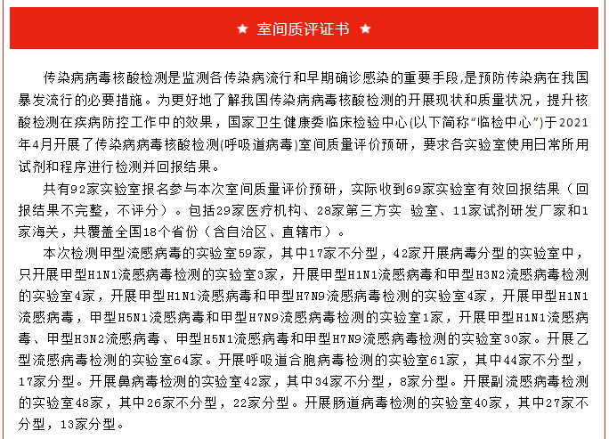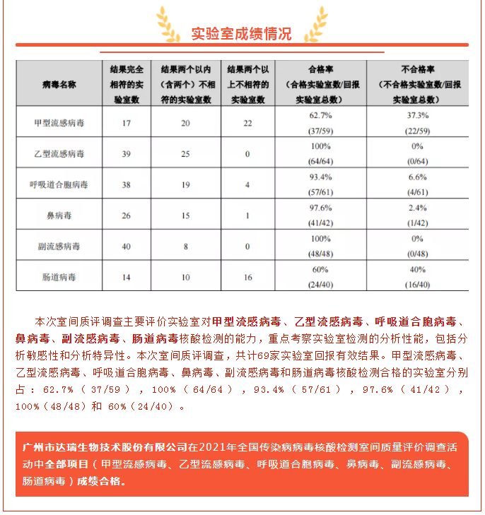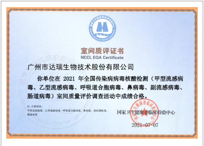 喜訊|廣州市達(dá)瑞生物技術(shù)股份有限公司在2021年全國傳染病病毒核酸檢測室間質(zhì)量評價(jià)調(diào)查活動中全部項(xiàng)目成績合格